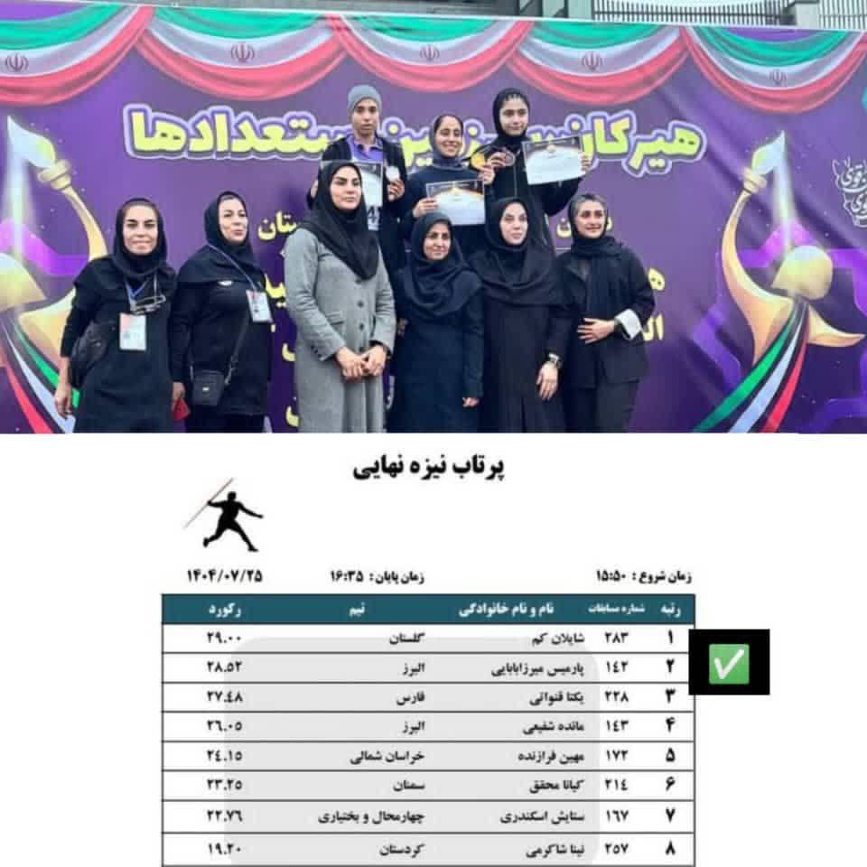 پارمیس میرزابابایی، ورزشکار نوجوان اهل هشتگرد از شهرستان ساوجبلاغ، در رقابتهای قهرمان کشوری استعدادهای برتر که در شهر گرگان برگزار شد، توانست در رشته پرتاب نیزه به مقام نایبقهرمانی دست یابد.